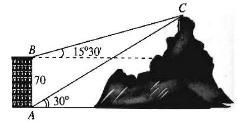 Câu 3. Từ hai vị trí A và B của một tòa nhà, người ta quan sát đỉnh C của ngọn núi như hình dưới. Biết rằng AB = 70m, phương nhìn AC tạo với phương nằm ngang góc \({30^o}\), phương nhìn BC tạo với phương nằm ngang góc \({15^o}30’\). Tính chiều cao của ngọn núi (làm tròn đến hàng đơn vị).