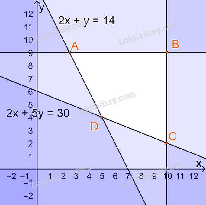 Ta có hệ bất phương trình: \(\left\{ \begin{array}{l}0 \le x \le 10\\0 \le y \le 9\\2x + y \ge 14\\2x + 5y \ge 30\end{array} \right.\)