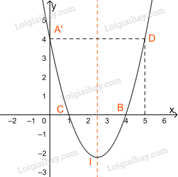 Điểm \(D(5;4)\) đối xứng với \(A’\left( {0;4} \right)\) qua trục đối xứng.