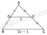 \(\begin{array}{l} \Rightarrow DE = \frac{1}{2}\left( {2x – 1} \right)\\5 = x – \frac{1}{2}\\x = 5,5\end{array}\)