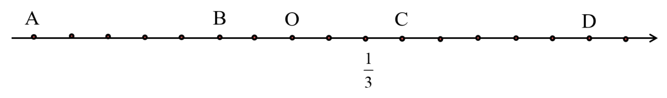 Điểm B nằm bên trái gốc O và cách gốc O một khoảng bằng \(\dfrac{1}{3}\) nên điểm B biểu diễn số hữu tỉ \(\dfrac{{ – 1}}{3}\).