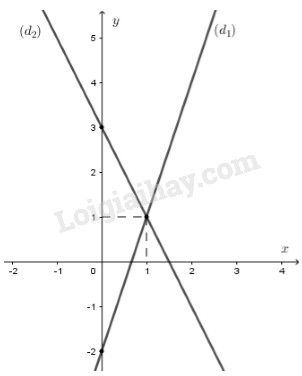 a) Vẽ đồ thị \(\left( {{d_1}} \right)\) của hàm số \(y = 3x – 2\) và đồ thị \(\left( {{d_2}} \right)\) của hàm số \(y = – 2x + 3\) trên cùng hệ trục tọa độ.