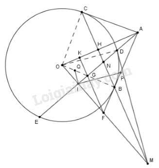 b) Vẽ cát tuyến \(ADE\) nằm bên trong góc \(BAO\) (\(AD\) nhỏ hơn \(AE\)). Vẽ \(OI\) vuông góc với \(DE\) tại \(I.\) Tia \(OI\) cắt \(AB\) tại \(F.\) Gọi \(G\) là giao điểm của \(DE\) với \(OB\) và \(Q\) là trung điểm của \(OG\). Tia \(FG\) cắt tia \(AO\) tại \(K.\) Chứng minh \(FK\) vuông góc với \(OA\) và \(QI\) là tiếp tuyến của đường tròn ngoại tiếp tam giác \(FIA.\)