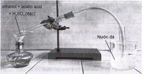 (b) Sơ đồ thí nghiệm sau mô tả quá trình thực hiện phàn ứng trên. Hãy cho biết vai trò của cốc nước lạnh trong thí nghiệm. Sau khi kết thúc phản ứng, ta thêm một ít nước vào ống nghiệm, lắc nhẹ thì có hiện tượng gì xảy?
