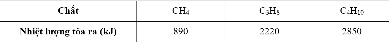 Khí biogas (giả thiết chỉ chứa CH4) và khí gas (chứa 40% C3H8 và 60% C4H10 về thể tích) được dùng phổ biến làm nhiên liệu và đun nấu. Nhiệt lượng tỏa ra khi đốt cháy hoàn toàn 1 mol các chất như bảng sau: