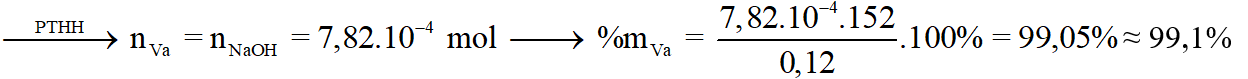 Mẫu vanillin đủ tiêu chuẩn dùng trong công nghiệp sản xuất dược phẩm và thực phẩm cần có trên 99% về khối lượng là vanillin. Để định lượng một mẫu vanillin, người ta làm như sau: Hoà tan 0,120 gam mẫu trong 20 mL ethanol 96% và thêm 60 mL nước cất, thu được dung dịch X. Biết X phản ứng vừa đủ với 7,82 mL dung dịch NaOH nồng độ 0,1 M và tạp chất trong mẫu không phản ứng với NaOH. Hãy tính % khối lượng vanillin trong mẫu vanillin trên xem có đủ tiêu chuẩn dùng trong công nghiệp sản xuất được phẩm và thực phẩm không? Làm tròn sau dấu phảy 1 số