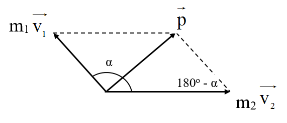 Do véc tơ động lượng của 2 vật tạo với nhau một góc α. Nên độ lớn động lượng của hệ tính bởi định lý hàm số cos: