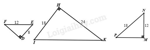 \(\begin{array}{l}\widehat D = \widehat M = {90^0}\\\frac{{DE}}{{MN}} = \frac{{EF}}{{NP}}\left( {\frac{8}{{12}} = \frac{{12}}{{18}}\left( { = \frac{2}{3}} \right)} \right)\end{array}\)