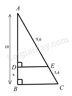 Do đó \(\frac{{AB}}{{BC}} = \frac{{AD}}{{DE}}\) hay \(\frac{{10}}{{9,6 + 5,4}} = \frac{{AD}}{{9,6}}\)