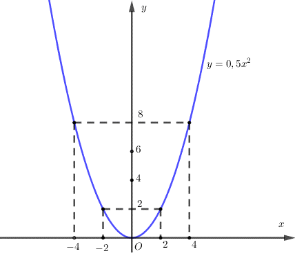 Đồ thị hàm số (P) có hình dạng đường cong đi qua các điểm \(\left( {0;\;0} \right),\;\;\left( { – 2;\;2} \right),\,\left( { – 4;8} \right),\;\;\left( {2;\;2} \right),\,\,\left( {4;8} \right)\)