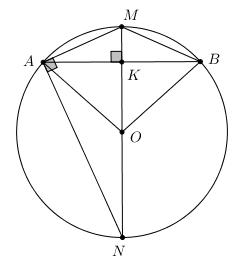 M là điểm chính giữa của cung AB \( \Rightarrow OM \bot AB\) và K là trung điểm của AB
