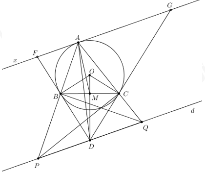 Lại có \(DB = DC\) (tính chất hai tiếp tuyến cắt nhau) \( \Rightarrow DP = DQ \Rightarrow D\) là trung điểm của PQ.