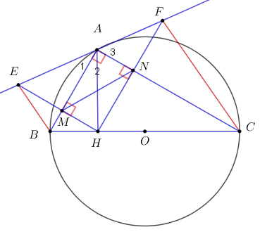 Lại có \(\widehat {ABH} = {90^0} – \widehat {BAH}\\\widehat {ANM} = {90^0} – \widehat {AMN}\\ \Rightarrow \widehat {ABH} = \widehat {ANM}\;\;hay\;\;\widehat {MBC} = \widehat {ANM}\)