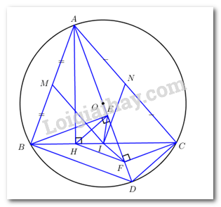 1. Cho tam giác ABC \(\left( {AB < AC} \right)\) có ba góc nhọn nội tiếp đường tròn \(\left( O \right)\), AH là đường cao của tam giác ABC. Kẻ đường kính AD của đường tròn \(\left( O \right)\). Từ hai điểm B và C kẻ \(BE \bot AD\) tại E, \(CF \bot AD\) tại F.