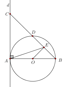 Cho đường tròn \(\left( {O;R} \right)\) đường kính AB. Gọi d là tiếp tuyến của đường tròn tại A, C là điểm chuyển động trên đường thẳng d. BC cắt (O) tại D \(\left( {D \ne B} \right)\). Gọi E là trung điểm của BD.