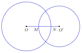 Cho đường tròn \(\left( {O;\;6cm} \right)\) và đường tròn \(\left( {O’;\;5cm} \right)\) có đoạn nối tâm \(OO’ = 8cm.\) Biết đường tròn \(\left( O \right)\) và \(\left( {O’} \right)\) cắt \(OO’\) lần lượt tại \(N,\;M.\) Tính độ dài \(MN.\)