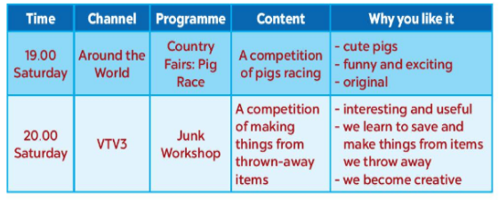 2. I like the Junk Workshop programme on VTV3 channel. It’s on at 20.00 on Sunday. In this programme, I learn to save and make different things from the items we usually throw away after using things like cans, bottles,or papers. I also learn to be more creative. I like this programme because it’s very interesting and useful.