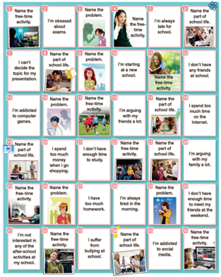 Give advice for the problems in the squares or name what you see in the picture. Choose any square when it's your turn and if you get it right, the square is yours. Get four squares in a horizontal, vertical or diagonal row to win the game!