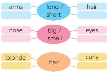 (tóc: dài, ngắn, đen, thẳng, xoăn, hói, …)