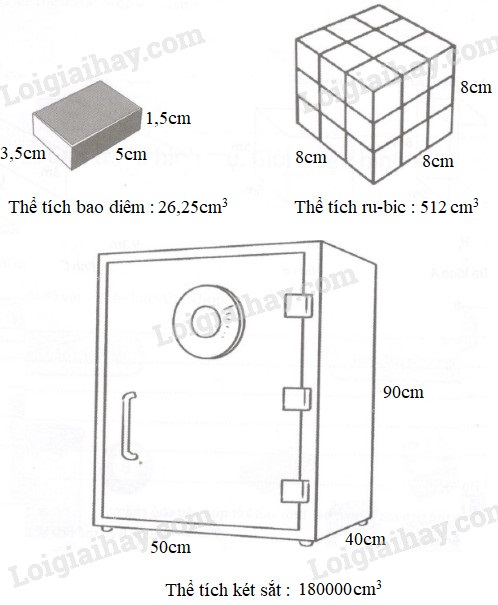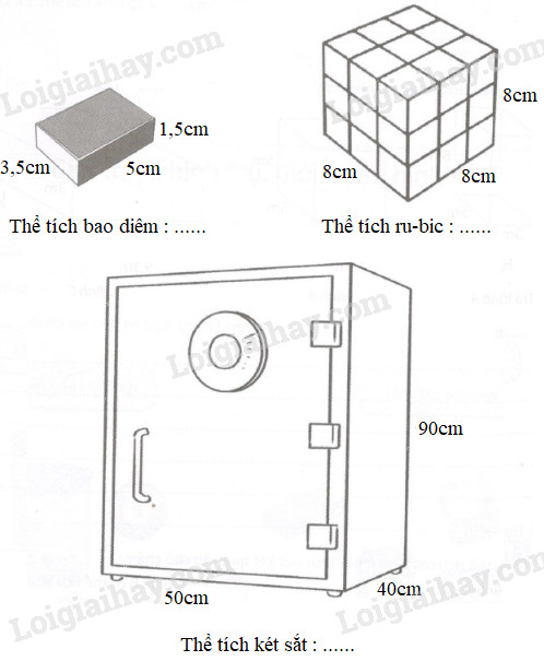 Một bao diêm hình hộp chữ nhật, một khối ru-bic hình lập phương và một két sắt hình hộp chữ nhật có kích thước như trong hình vẽ dưới đây. Tính rồi điền thể tích mỗi đồ vật vào chỗ chấm.