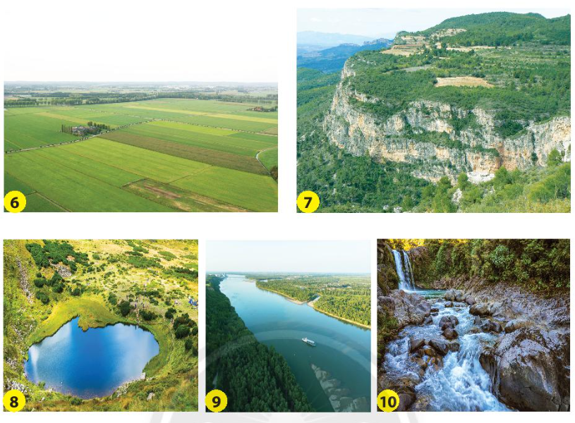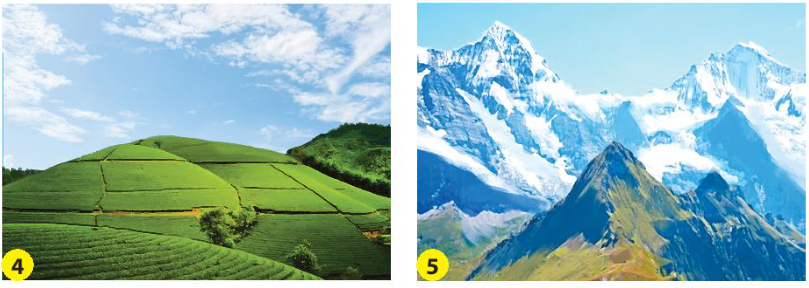 Chỉ trên hình và nói với bạn: Tên các dạng địa hình trên Trái Đất. Tên gọi của những vùng có nước trên mặt đất. Hình nào sau đây thể hiện đồng bằng, đồi, núi, cao nguyên, sông, hồ, suối? Vì sao em biết?
