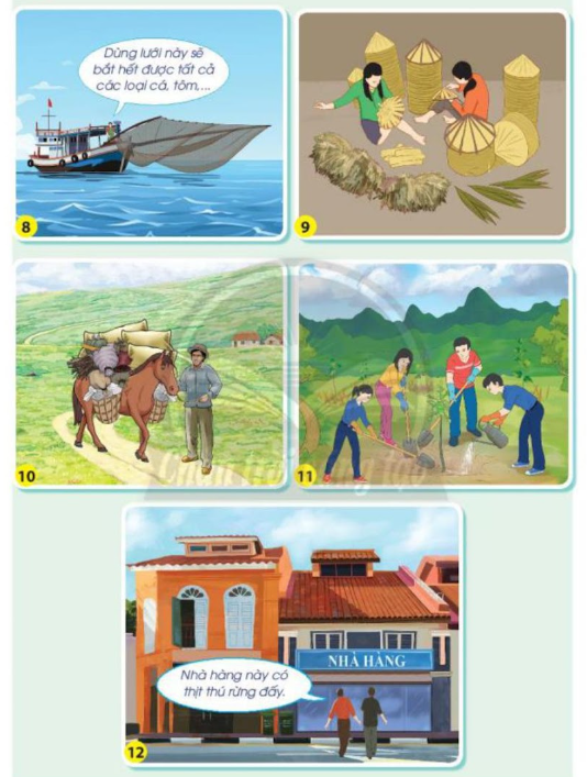 – Hình 8: Cách sử dụng thực vật, động vật của mọi người là không đúng. Vì khi thai thác thủy hải sản, cần khai thác hợp lý bằng cách không đánh bắt hải sản nhỏ mà chỉ được phép đánh bắt hải sản đủ lớn. Vì khi đánh bắt hết, sẽ không có lượng hải sản tiếp tục duy trì có thể dẫn đến cạn kiệt. Bởi vậy không được sử dụng lưới dày để đánh bắt tất cả các loại hải sản.