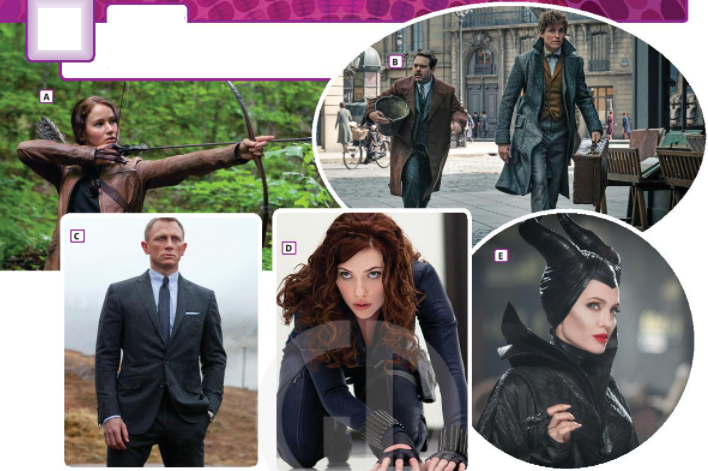 1. Look at the photos of famous film characters. Match them with the names below. What films do they appear in? Do you know who the actors are? 2. Match the sentence beginnings (1-4) with the endings (a-d). Then match the descriptions with four of the characters in exercise 1. 3. Add the adjectives below to the table. Note the order of the adjectives. 4. Work in pairs. How many different items of clothing can you write down? Include all the ones in exercise 2. Put them into groups A and B below.