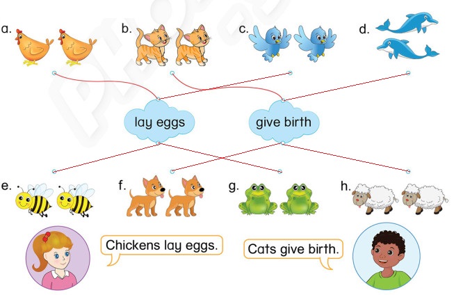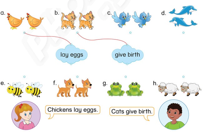 g. Frogs lay eggs. (Ếch đẻ trứng.)