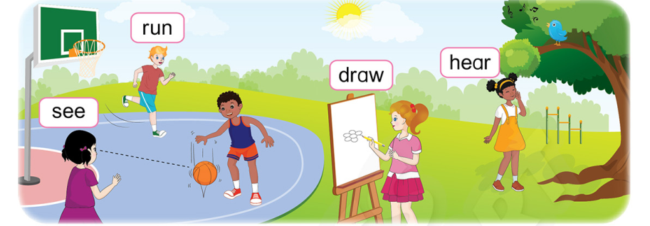 *Giáo viên sẽ cho một động từ bất kì, học sinh vừa diễn hành động đó vừa nói.