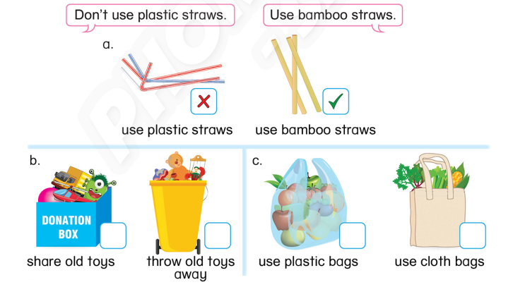 1. Listen and repeat. 2. Tick a (√) or cross (X) and say.