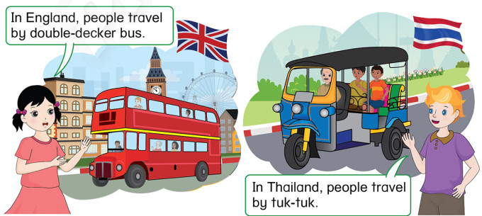 In Thailand, people travel by tuk-tuk. (Ở Thái Lan, người ta du lịch bằng xe túc-túc.)