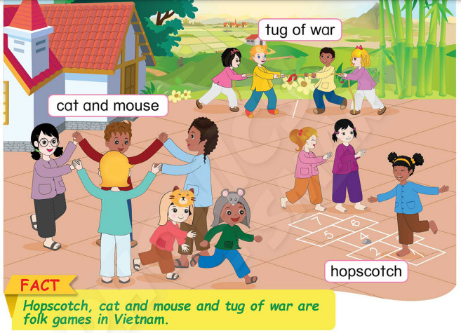 Hopscotch, cat and mouse and tug of war are folk games in Vietnam.