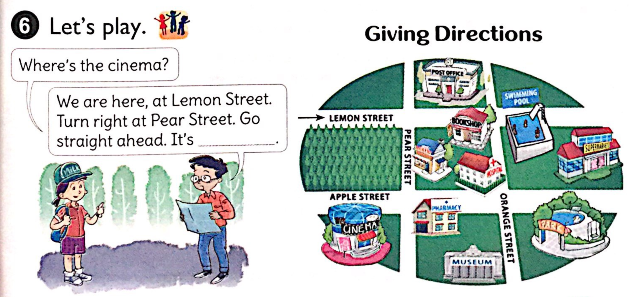 (Bạn nam: Chúng ta ở đây, tại đường Lemon. Rẽ phải là đường Pear. Đi thẳng về phía trước. Nó ở góc đường Apple.)