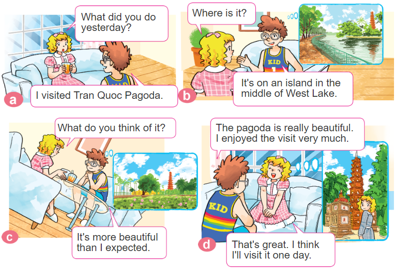 a) What did you do yesterday? Ngày hôm qua bạn đã làm gì?I visited Tran Quoc Pagoda. Mình đã viếng chùa Trấn Quốc.b) Where is it? Nó ở đâu?It's on an island in the middle of West Lake.
