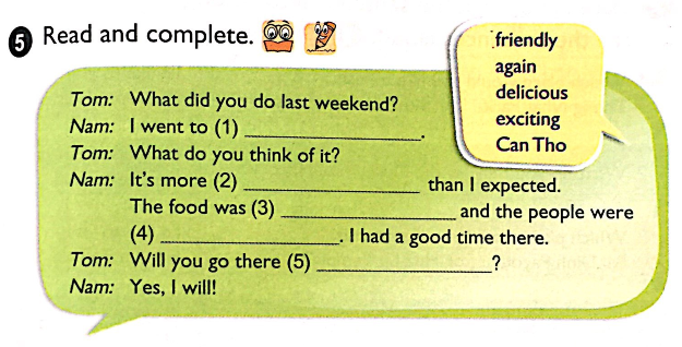 (1) Can Tho (2) exciting (3) delicious (4) friendly (5) again