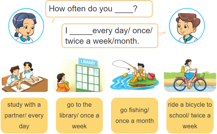 (Bạn có thường đi/cưỡi xe đạp đến trường không? Tôi đi/cưỡi xe đạp đến trường hai lần một tuần. / Hai lần một tuần.)