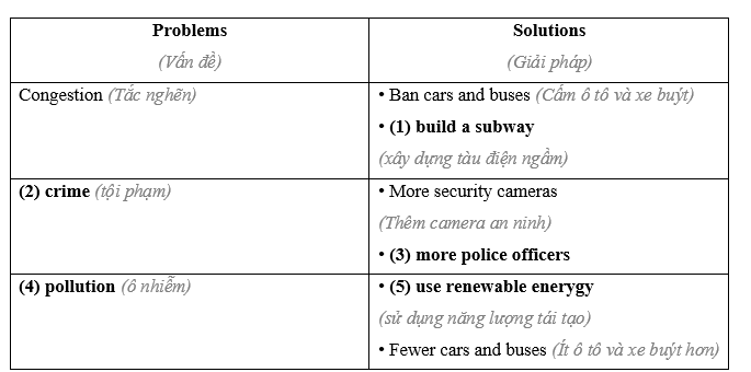 (Nói theo cặp: Thảo luận về các vấn đề phổ biến ở các thành phố và các giải pháp tiềm năng cho những vấn đề này. Hoàn thành bảng dưới đây.)