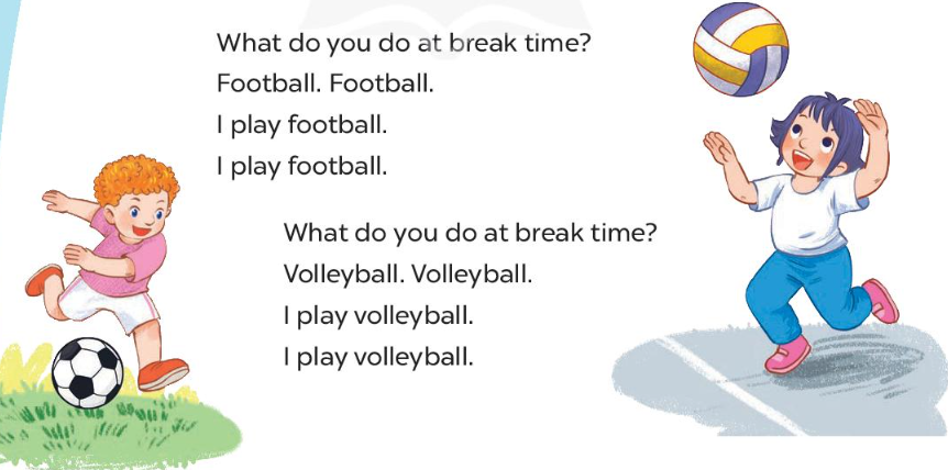 Teacher: What do you do at break time? (Các em làm gì vào giờ giải lao?)