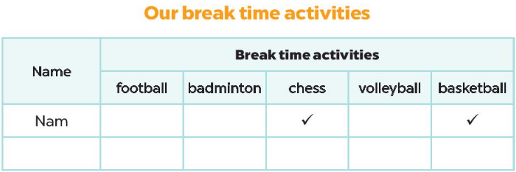 Hỏi từng bạn trong lớp hoặc trong nhóm về các hoạt động mà các bạn đã làm trong giờ nghỉ giải lao ở trường. Bạn nào làm gì thì đánh dấu vào ô hoạt động giờ giải lao trong bảng – “Break time activities”.