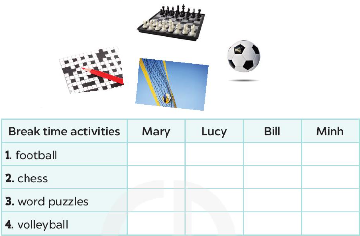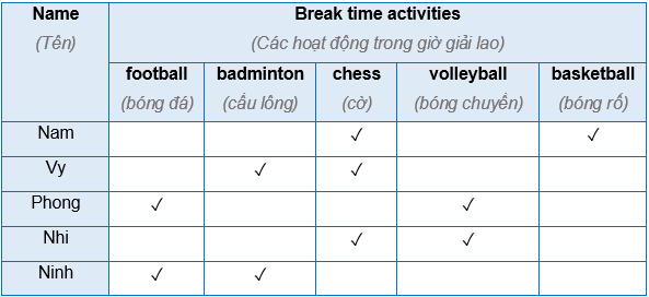Hỏi từng bạn trong lớp hoặc trong nhóm về các hoạt động mà các bạn đã làm trong giờ nghỉ giải lao ở trường. Bạn nào làm gì thì đánh dấu vào ô hoạt động giờ giải lao trong bảng – “Break time activities”.