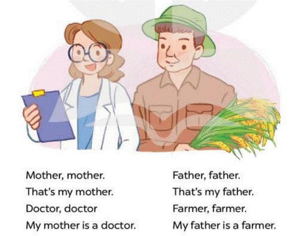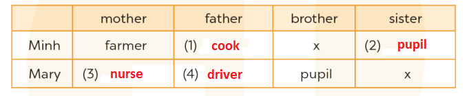 Hello. My name’s Mary. This is my family. My mother is a nurse. My father is a driver. My brother is a pupil. I’m a pupil, too. (Xin chào. Tôi tên là Mary. Đây là gia đình tôi. Mẹ của tôi là y tá. Bố tôi là tài xế. Em trai tôi là học sinh. Tôi cũng là học sinh.)