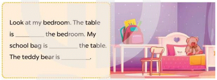 Look at my bedroom. The table is in the bedroom. My school bag is on the table. The teddy bear is on the bed.