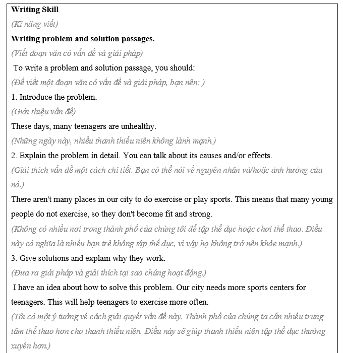 (Bây giờ, hãy viết một đoạn văn về vấn đề và giải pháp về vấn đề mà bạn đã thảo luận trong phần Nói. Sử dụng hộp Kỹ năng Viết và ghi chú nói của bạn để giúp bạn Viết 80 đến 100 từ.)