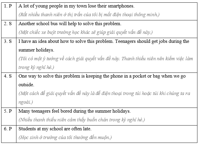 (Đọc các câu và viết P cho vấn đề hoặc S cho giải pháp.)
