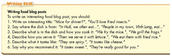 (Đọc cách viết bài đăng blog đồ ăn. Sau đó, đọc blog của Long và khoanh 6 điểm được liệt kê bên dưới.)