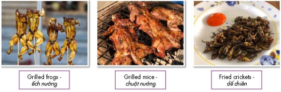 In pairs: What unusual foods can you think of? What's the strangest? a. A tour guide is talking to a group of tourists in Hà Giang Province. Where are the people?b. Now, listen and choose the best word(s) to complete the sentences.a. Read the blog post and match the pictures to the underlined words.b. Now, read and fill in the blanks.c. In pairs: Which strange foods do you want to try?a. Read about writing food blog posts. Then, read Long's blog and circle the six points listed below.b. Number