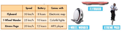 – The Flyboard has electronic map, 1-Wheel Wonder has colorful lights, the Xtreme Pogo has MP3 player.