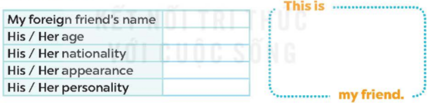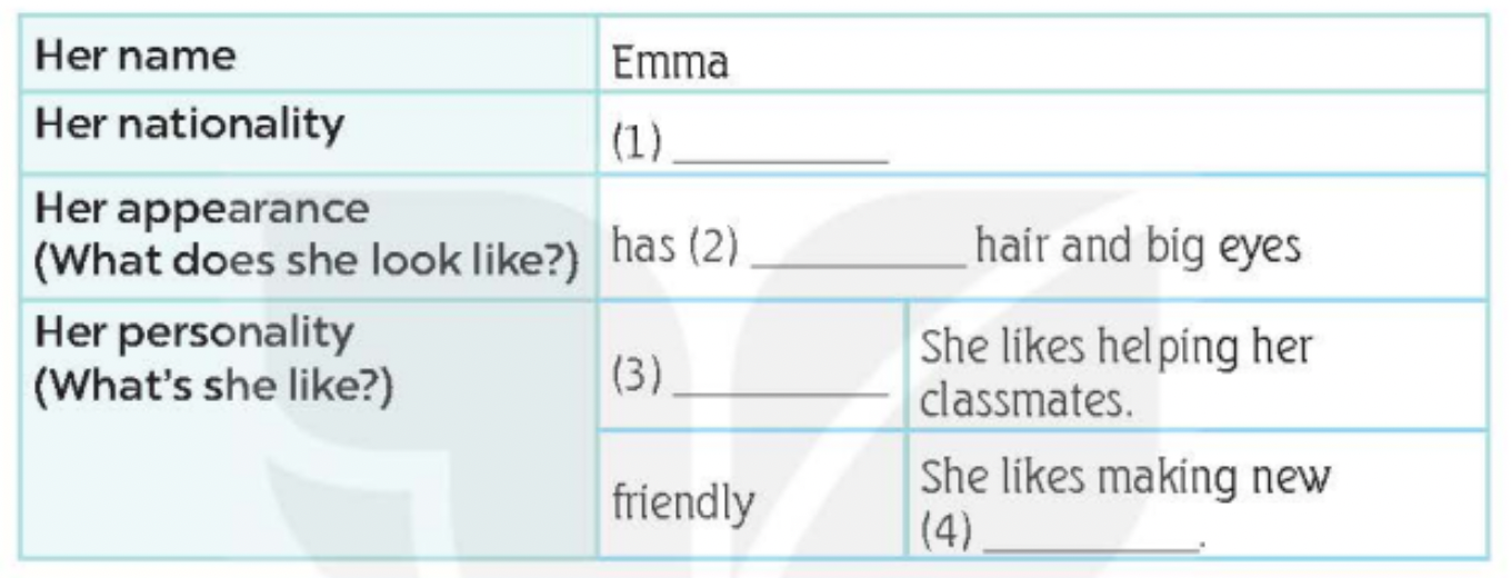 Mình có một người bạn mới. Tên cô ấy là Emma. Cô ấy là người Mỹ. Cô ấy ở khối 5. Cô ấy có tóc dài và mắt to.