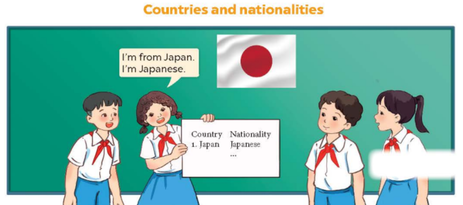 Chuẩn bị quốc kì của các nước, nói ra tên quốc gia và quốc tịch của nước đó. Sử dụng cấu trúc: