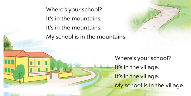 My school is in the mountains. (Trường của tôi ở vùng núi.)